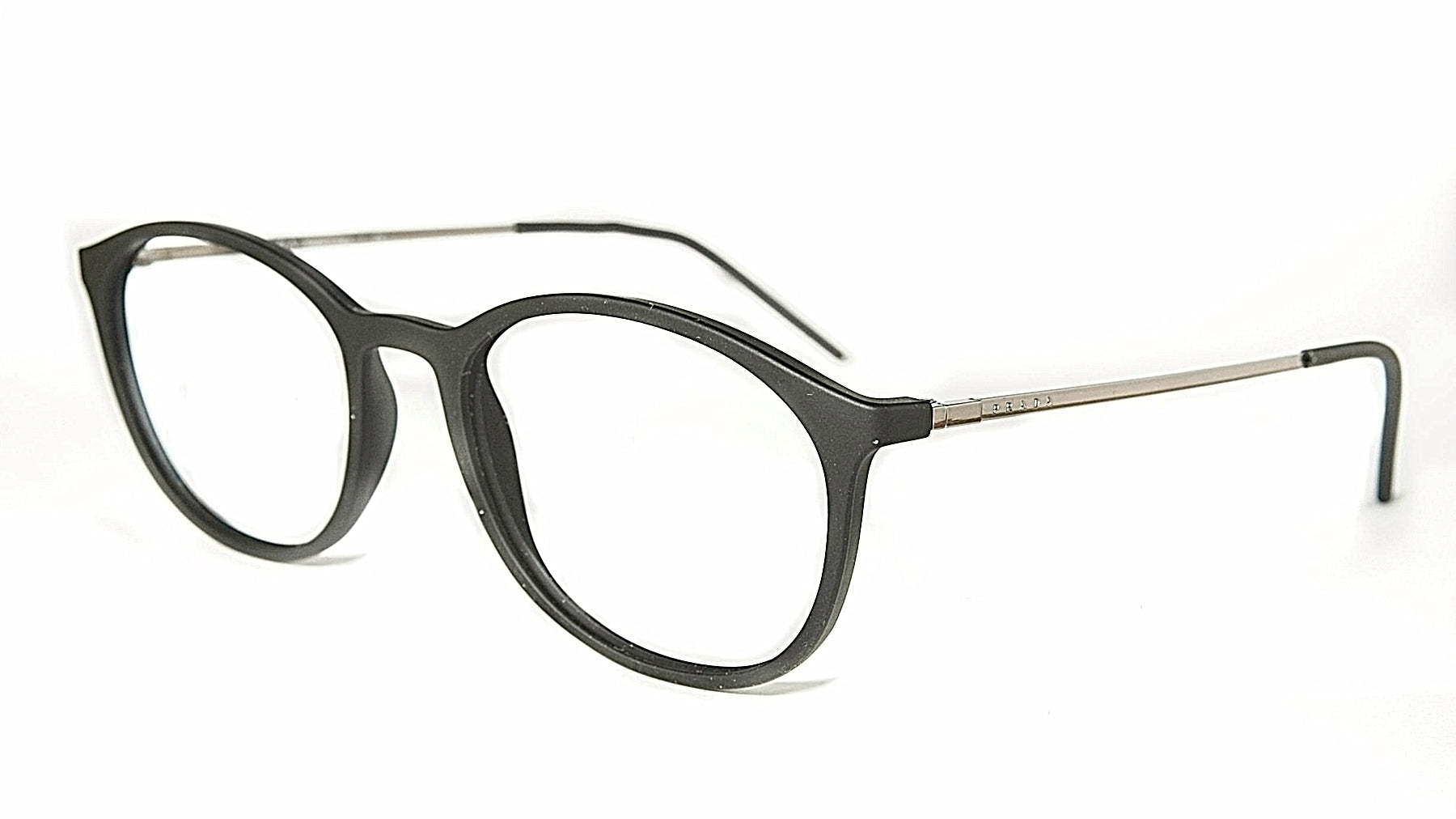 Ex showroom stock with a tiny “kink” in the tip of the right temple. This really lightweight frame has a black rubber front with silver temples.
