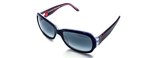 Classic black plastic front with pale blue on the inside. The temples are brown and sprung jointed.
