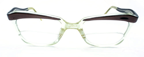 Ladies full rim, two tone brown/crystal plastic frame with “supra” nylon for reading section in the bottom and no lens in the top. Showing slight discolouring on the bridge.