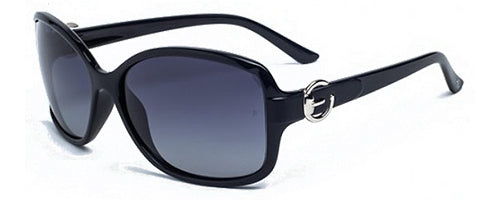 Ladies black plastic frame, black temples with “round buckle” motif on the sides.