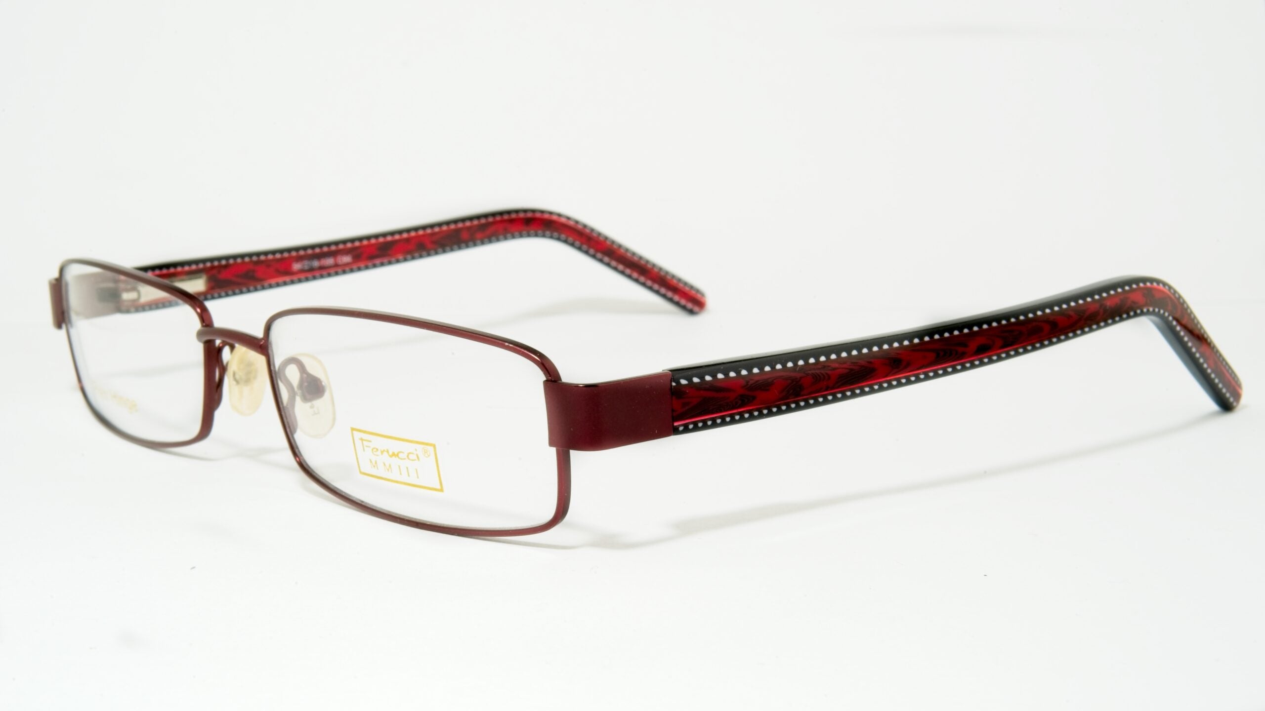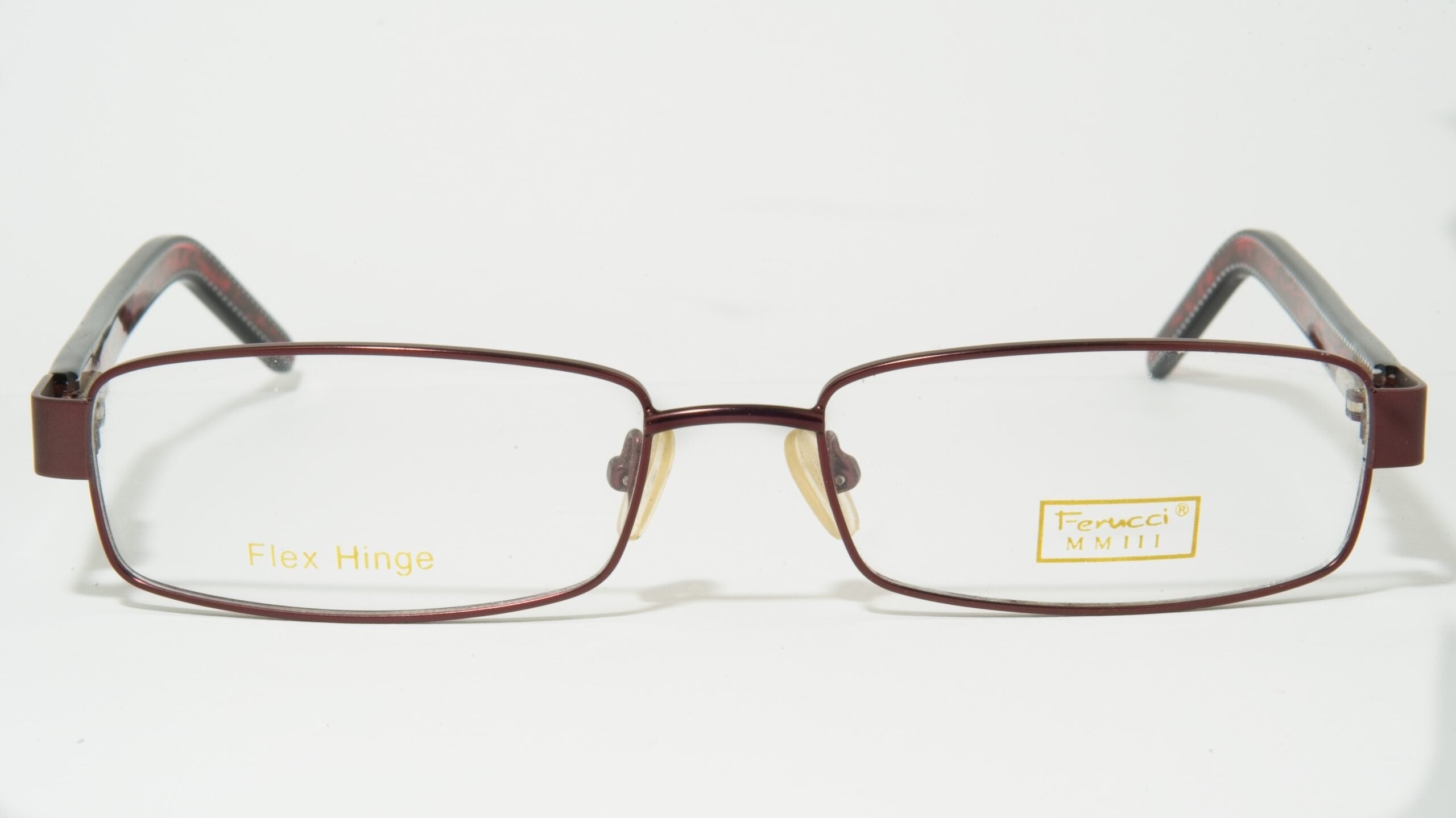 A fun pair of glasses. Burgundy metal front with a “stitched leather” look acetate sprung temples.