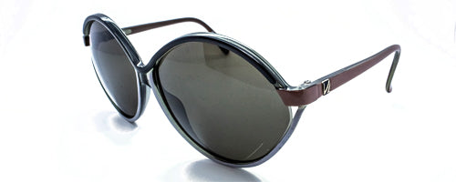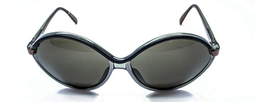 Beautiful example of a large plastic “tri-tone” sun glass. Made in Germany, this grey/black plastic front has brown temples and green/grey lenses.